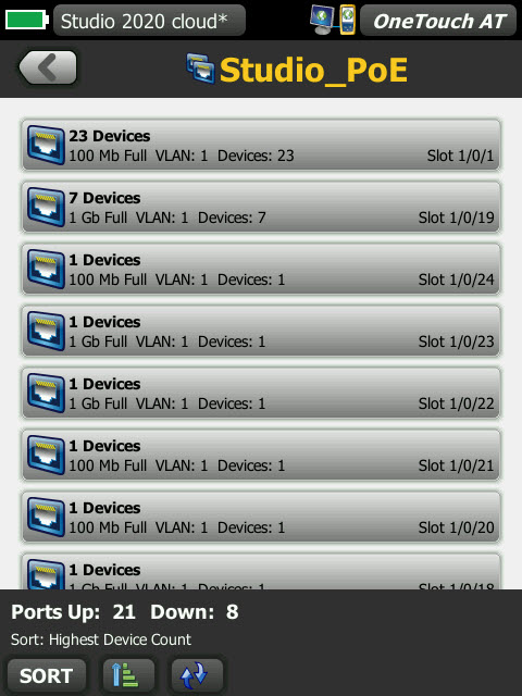 6、自動發現銅線和光纖連接設備以及關鍵設備屬性。從十四種不同排序中選擇,獲取有線網絡的不同視圖。例如,根據 IPv4 或 IPv6 地址進行排序可識別已使用的和可用的地址。或者根據交換機名稱/槽口/端口進行排序,可以了解網絡設備的連接位置。根據已發現的問題進行排序可以快速識別潛在的問題。其他發現輔助型分析工具有助于故障診斷和配置文件創建。例如,多端口信息統計工具可查看交換機、路由器和 AP 端口統計信息,包括速度、duplex、槽口、端口、VLAN、主機數、利用率、丟棄和錯誤。端口工具上的設備可提供單獨交換機端口連接的設備的詳細信息。路徑分析工具提供了從 OneTouch AT 至目標設備的第 2 和 3 層跟蹤路由,包括每次跳轉時間以及 SNMP 交換機和路由器端口統計信息。