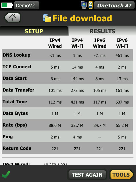 測試結果同時顯示,以輕松進行有線/Wi-Fi 和 IPv4/IPv6 性能對比。以下為幾個示例:ping(拼接)您的 WLAN 控制器,連接至 VoIP 呼叫管理器上的端口 2000,下載具有 Web 界面的應用程序頁面,從服務器上傳或下載文件,訂閱多播組,訪問點播流媒體視頻服務器中的視頻內容,或者向您的手機發送文本消息電子郵件。