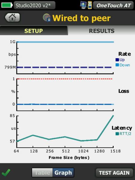 4、測量到對等點或反射器的有線端對端路徑性能,以驗證和記錄鏈路就緒情況和 SLA 符合性。性能指標包括吞吐率、幀丟失、抖動和延遲。測試遠程對等點以獲取上行和下行結果。測試遠程反射器以獲取往返結果。在同一個 OneTouch 的有線接口之間進行測試以獲取非遠程上行和下行結果。測試速率為 1 Gbps 時的有線性能。定義持續時間、幀大小、DSCP 值和通過/失敗損耗限值。將結果保存為記錄性能的報告。