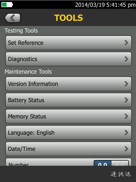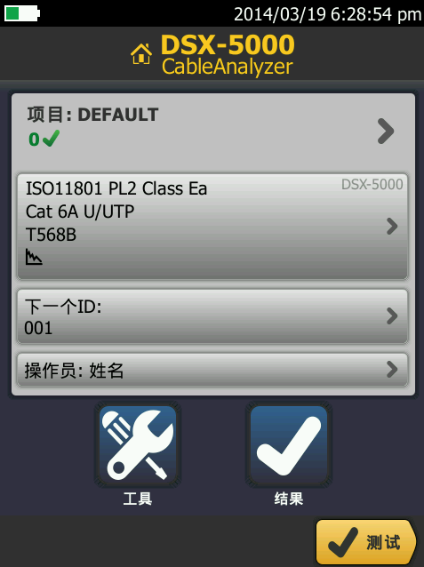 取Cat?6A/Class?EA?永久鏈路適配器,裝在主機上,輔機裝上Cat?6A/Class?EA?通道適配器。然后將永久鏈路適配器末端插在Cat?6A/Class?EA?通道適配器上;打開輔機電源,輔機自檢后,“PASS”燈亮后熄滅,顯示輔機正常。打開主機電源,點擊“工具”,顯示設置參照、診斷、版本信息、電池狀態、內存狀態、語言、時間日期等。點擊“設置參照”按測試(或者白色TEST按鈕)開始自校準,顯示“已完成設置參照”說明自校準成功完成。