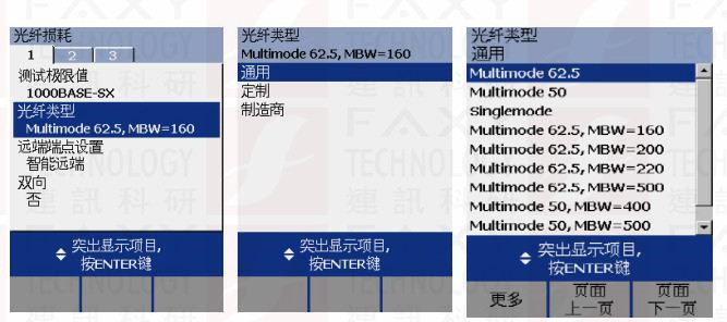 設置“光纖類型” ,DTX中光纖類型有:通用類型、定制類型、制造商類型(按所測光纖鏈路類型選擇)