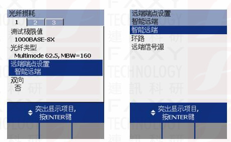 “遠端端點設置”有3中方式:智能遠端(用智能遠端模式來測試雙重光纖布線)、環路(用環回模式來測試基準測試線與光纜繞線盤)、遠端信號源(用光學信號源來測試單條光纖鏈路)