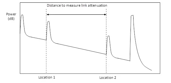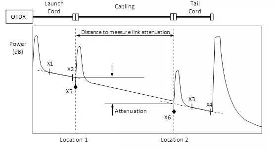 圖4顯示反向散射軌跡上的游標位置。X1和X2定義發射光纖的線性回歸區域。X3和X4定義了尾纖線性回歸區域。需要將X5放置在位置location 1處。為便于說明,X6顯示為“第6個游標”,并且需要放置在位置location 2處。