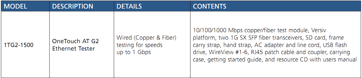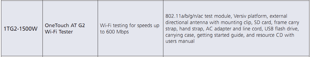 1TG2-3000名稱為OneTouch?AT?G2有線與無線網絡測試儀,包括主機,2個SFP模塊,定向天線,SD卡,便攜帶,充電器,U盤,WireView?1-6,RJ45跳線,RJ45轉換器,操作手冊,CD。相當于現在的1T-3000。