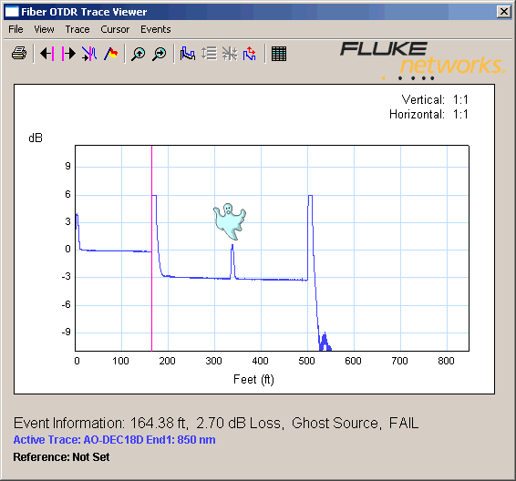 如果不是經驗非常豐富的OTDR用戶,很難僅憑觀察軌跡本身就能區分虛影和實際事件。沒有損耗的事件,或者在軌跡上表現為等距離重復的事件,很可能就是虛影。不過不用擔心,Fluke Networks 的 OptiFiber? Pro 能夠識別虛影事件和虛影源。