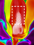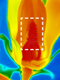 因素一:熱靈敏度決定熱像儀區(qū)分細微溫差的能力。同樣狀況下,右圖所用熱像儀的熱靈敏度更低,畫面清晰顯示花蕊細節(jié)的溫度分布,而左圖同區(qū)域只能看到一片紅色。 |