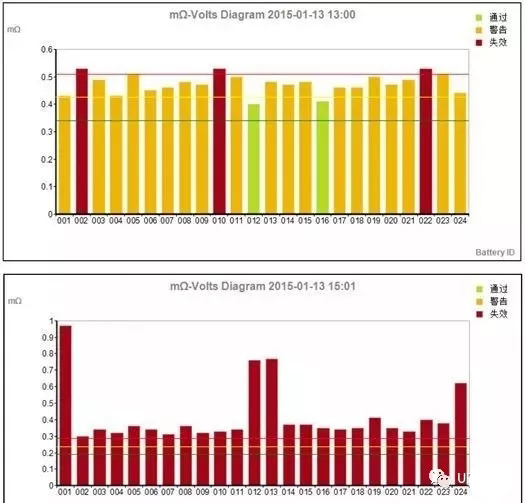 在確定了均值之后,運(yùn)維工程師把均值作為參考值輸入閾值比較,并設(shè)定了20%和50%的報(bào)警區(qū)間。返回序列測(cè)試模式主屏幕后,能夠清楚的發(fā)現(xiàn)處于劣化狀態(tài)的電池都較多。根據(jù)內(nèi)阻-容量的數(shù)據(jù)統(tǒng)計(jì)理論進(jìn)行相應(yīng)的估算,即:“內(nèi)阻上升25%,電池容量會(huì)下降20%”,除個(gè)別電池之外,這些電池都已經(jīng)超出鐵塔公司的接收標(biāo)準(zhǔn)。