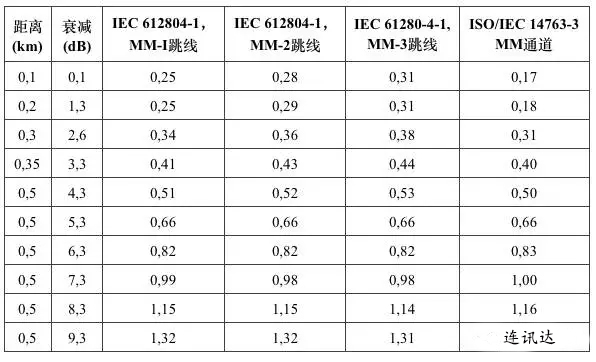 兩項(xiàng)國(guó)際標(biāo)準(zhǔn),ISO/IEC 14763-3和IEC 61280-4-1,目前都經(jīng)過(guò)重新修訂,提供了關(guān)于測(cè)量不確定度的指導(dǎo)。特別是根據(jù)安裝的布線長(zhǎng)度、損耗及測(cè)試方法提供了不確定度值。按照指導(dǎo)實(shí)施,您可非常確信安裝的布線能夠正常工作。例如,在IEC 61280-4-1標(biāo)準(zhǔn)中,第三版提供了一個(gè)關(guān)于多模布線設(shè)施衰減的表格,如表1所示。表1中還包括了ISO/IEC 14763-3標(biāo)準(zhǔn)定義的多模光纖設(shè)施的通道測(cè)試方法。注意,國(guó)際標(biāo)準(zhǔn)中使用的小數(shù)點(diǎn)是逗號(hào)而不是句號(hào)。