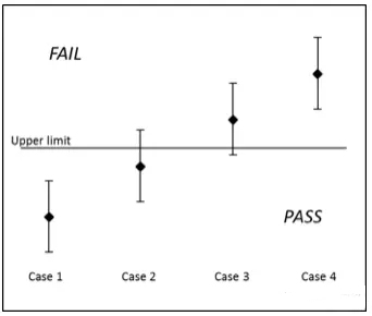 另一種方式,可以通過(guò)以下兩個(gè)例子進(jìn)行觀察。下圖中,測(cè)量值的不確定度“溢出”了測(cè)試限值。此時(shí),不合格的概率比較小,可能低于5%。