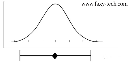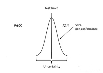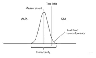 測(cè)量值接近限值時(shí),情況變得“模棱兩可”。實(shí)際應(yīng)用中,誤差帶形狀實(shí)際為下圖所示的鐘形曲線。鐘形曲線為概率分布圖。給出的測(cè)量值為曲線的最高點(diǎn)。
