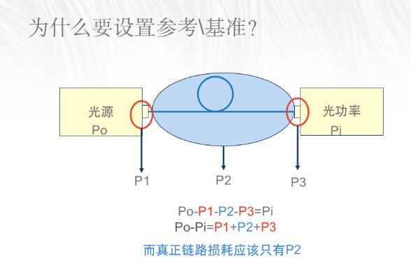 我們為什么要設置參考呢?我們不妨看上圖,假設光源輸出功率是Po,光源和被測鏈路連接處的損耗是P1,被測鏈路本身損耗是P2,被測鏈路和光功率接口連接處的損耗是P3,光功率實際收到的功率值是Pi。則: