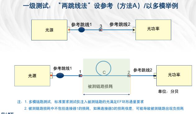 第一步,當然是設置參考值。在測試之前我們先把跳線影響歸零,“兩跳線法”之所以叫做兩跳線,就是因為在設置參考時,使用了兩根光跳線。如上圖所示,我們在校準測試中歸零了測試跳線1與測試跳線2,中間通過連接器3進行跳線連接,因此連接器3也在基準設置范圍內,予以扣除了。