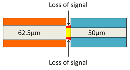 然而,另一個值得注意的情況是混合使用OM3或OM4元件與遺留的OM1 62.5/125光纖,后者的纖芯尺寸為62.5μm。將纖芯尺寸不同的光纖混合使用就像連接尺寸不同的水管一樣:當水從較粗的水管流向較細的水管時,必然會損失一部分水。光信號的道理是一樣的。將OM1與OM3或OM4光纖混合使用,當從62.5μm纖芯向50μm纖芯傳輸光信號時,必然存在損失。