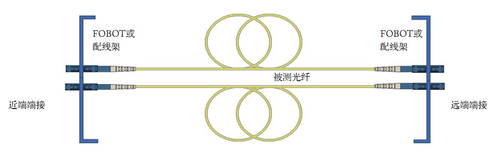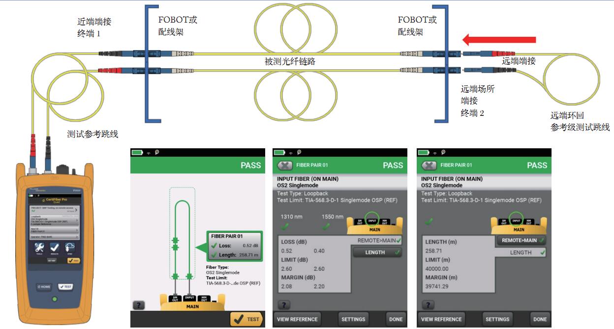 圖6.OLTS環回測試的測試連接,在遠端位置使用一根測試參考條線作為環回跳線。標準測試結果包含實測損耗、預算計算,用于鏈路和長度評估。
