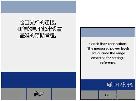 第四步:一旦出現測試基準不合格或者指標不對,設備本身會提出錯誤指示。詳細的量程范圍如下:當這個測試值處于以下這個量程范圍之內,變會出現以下的警告提示:Smart Remote Mode????????????DTX-MFM: -17.5 dBm to -27.0 dBm????????????DTX-GFM: -4.5 dBm to -10.0 dBm????????????DTX-SFM: -4.5 dBm to -10.0 dBm如圖: