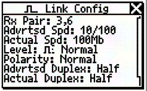 上圖是福祿克公司網(wǎng)絡(luò)萬用表Nettool NTS2-PRO的測(cè)試結(jié)果。從測(cè)試結(jié)果中可以得到網(wǎng)卡的電平是否正常,速度是多少以及工作的方式。從而也可以得出網(wǎng)絡(luò)是否與網(wǎng)絡(luò)連接設(shè)備是否匹配。