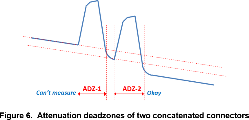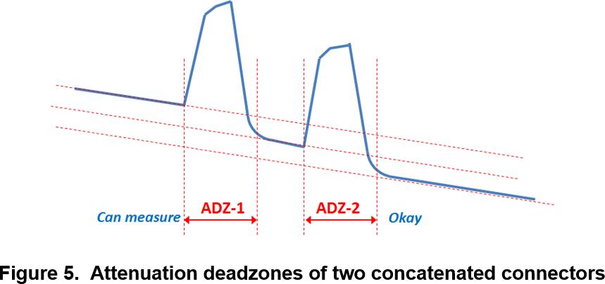 下面是一個事件死區示例。事件死區設置為 1 米。光纖網絡在兩個較長的長度中間有一根 1 米的跳接線。用戶希望 OTDR 定位并識別這個 1 米跳接線并盡量進行損耗和反射測量。僅當滿足技術指標的條件時,OTDR 可以測量 1 米跳接線的長度;兩個反射均必須在技術指標腳注定義的范圍內。請記住事件死區只定位反射峰,所以無法進行損耗測量。在另一示例中,衰減死區聲明為 2 米。光纖網絡在兩個長度中間有一根 2 米的跳接線。用戶希望能夠測量跳接線的損耗。如果每個反射之后都有足夠的反向散射,如圖所示,則 OTDR 將可以進行測量。