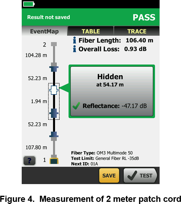 在圖 3 中,識別了 1.94 米長度的第一個連接器及位置、損耗和反射。因為兩個連接器間距小,所以第一個脈沖之后的反向散射可能會有所限制。第二個脈沖可能會融合到第一個脈沖的反向散射中。這樣,測量的損耗是從第二個脈沖的反向散射到第一個脈沖前側的反向散射末端。因此,實際測量的是兩個脈沖的損耗。