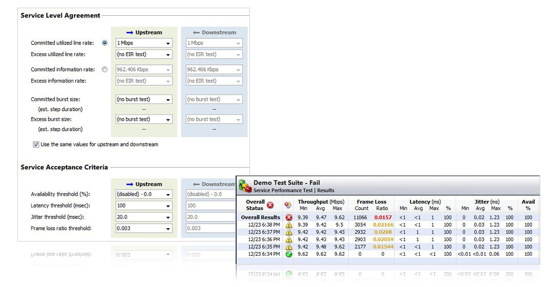 更全面地衡量 SLA 要求 – 包括超量信息和超額突發(fā)速率 (EIR/EBR) 以及可用性。在測(cè)試中檢測(cè)每個(gè)幀的延時(shí)和抖動(dòng),而不是每個(gè)測(cè)試只能檢測(cè)一個(gè)幀。